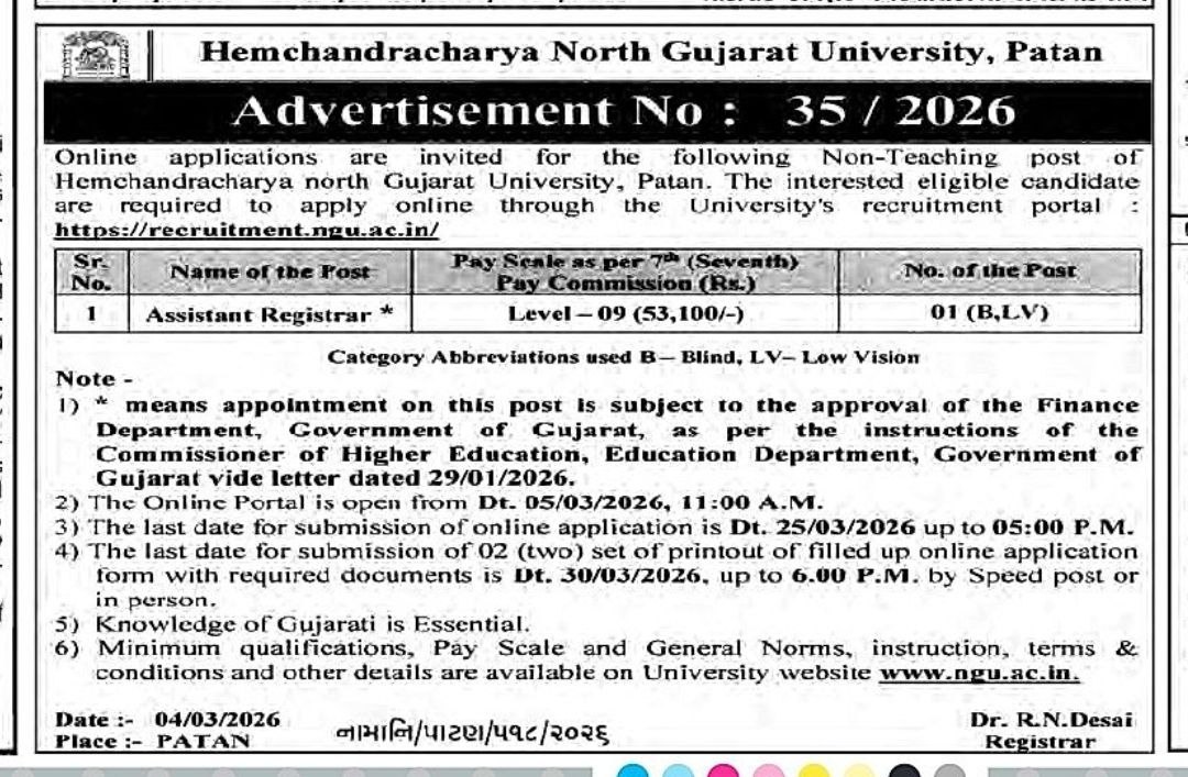 Welcome to the official update for the HNGU Assistant Registrar Recruitment 2026. Hemchandracharya North Gujarat University (HNGU), Patan has released an official notification for the recruitment of an Assistant Registrar. This is a great administrative job opportunity for eligible candidates seeking government university jobs in Gujarat.